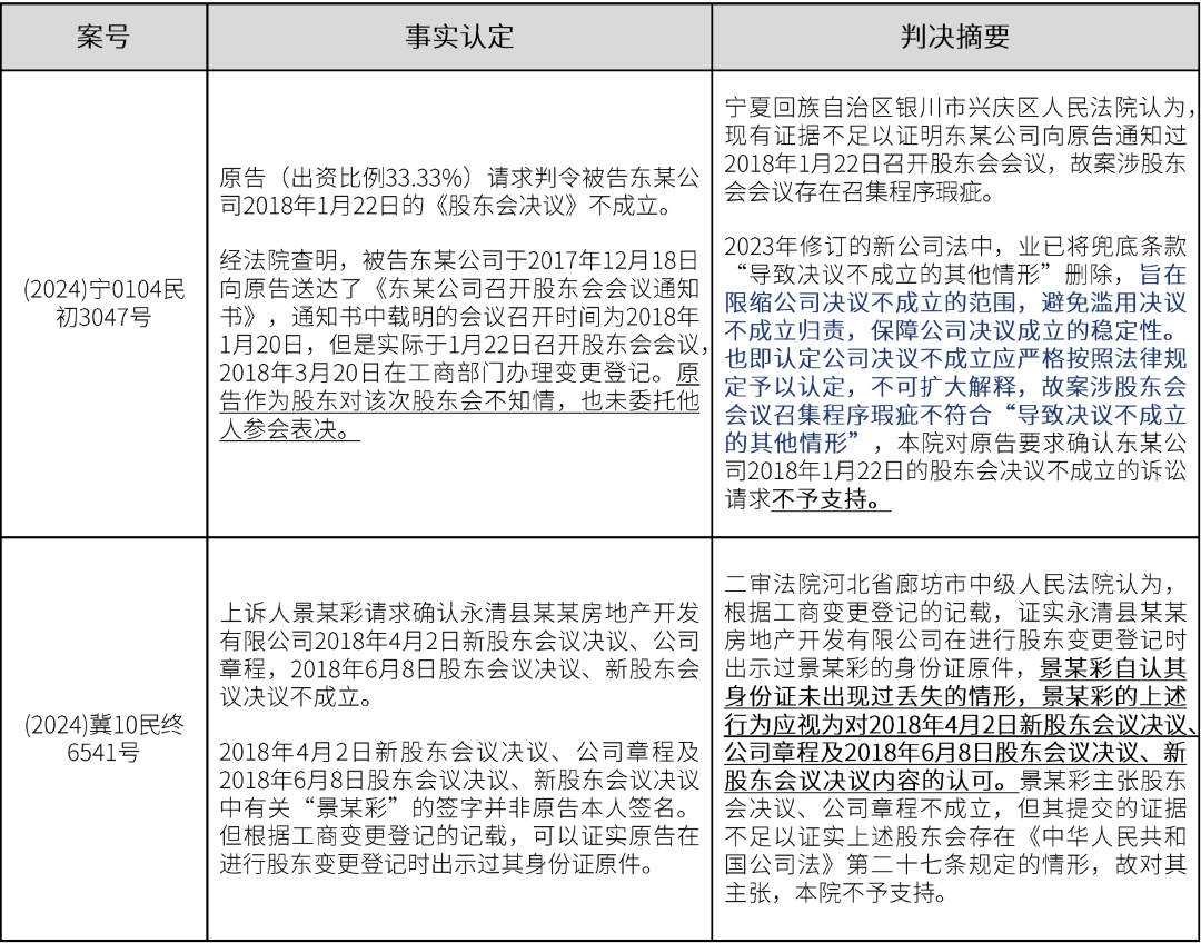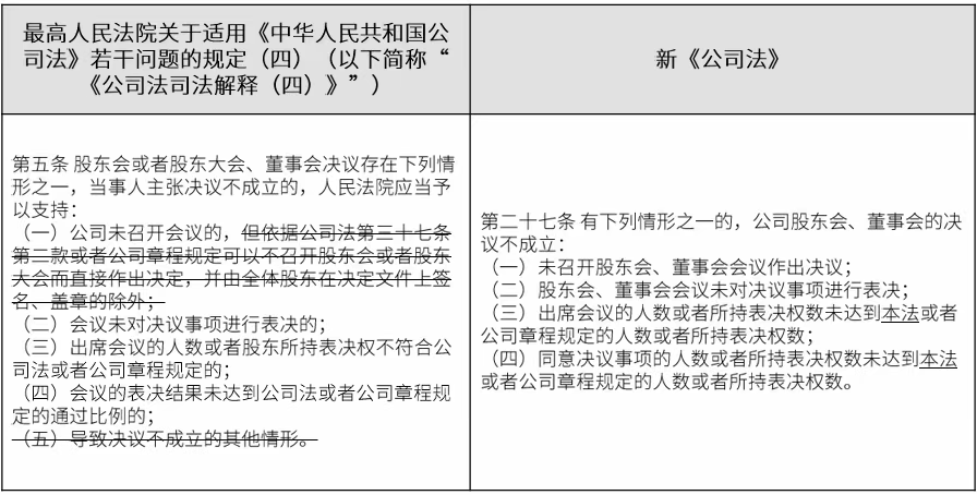 从条款适用方面。《公司法》第二十七条删除了《公司法司法解释(四)》第五条第五项“兜底条款”,明确导致决议不成立的程序瑕疵类型,从而一定程度上明确了决议不成立与决议可撤销之间的适用界限。